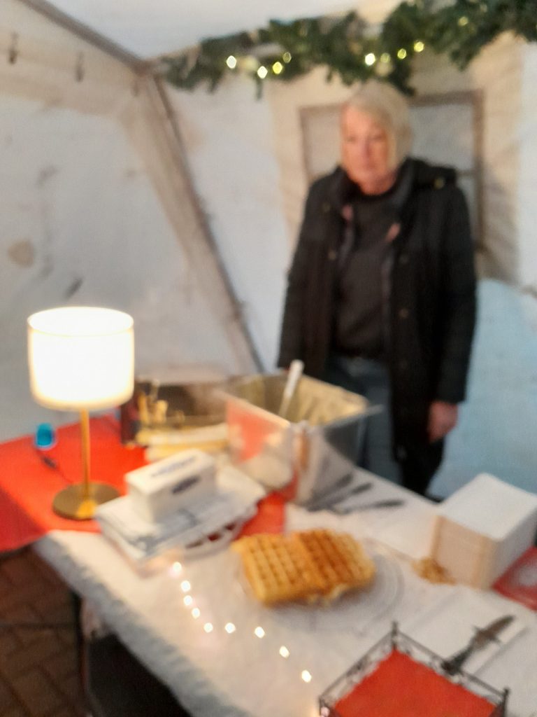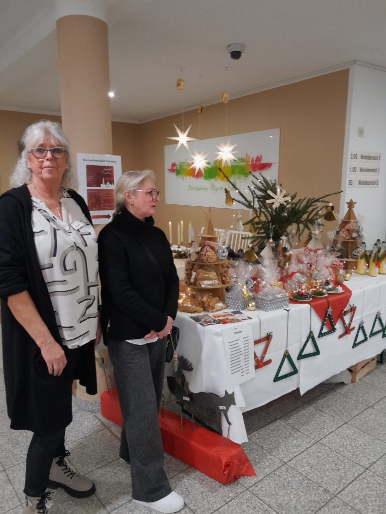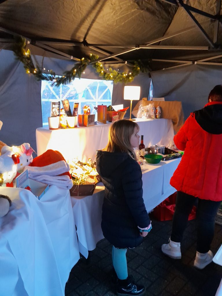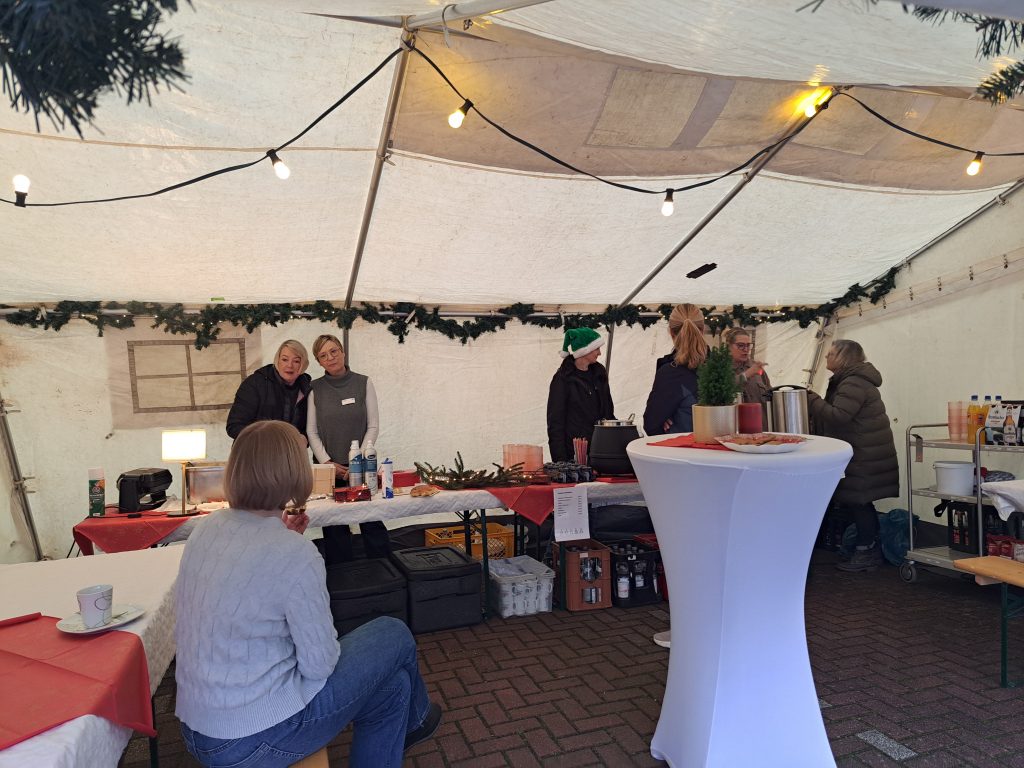 Neben den kulinarischen Verlockungen wie z.B. frischen Waffeln, Kuchen, duftenden Glühwein, leckeren Kinderpunsch, warmen Kakao, brutzelnden Würstchen, gab es auch selbstgebastelte Windlichter, Metallkunst und einen Stand mit Stickwaren von der Hospizgruppe „Dasein“.